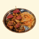 タンドール(壺窯)で焼いたチ キン、お魚、エビ、ケバブ (ひき肉串焼き)に、ミント・チャツ ネ(ソース)が添えてあります。