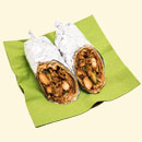 全粒粉を使った平たいパンで、タンドリーチキンの細切りと野菜を包んだラップ。