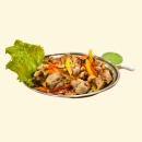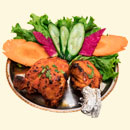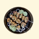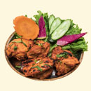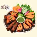 タンドール(壺窯)で焼いたチ キン、お魚、エビ、ケバブ (ひき肉串焼き)に、ミント・チャツ ネ(ソース)が添えてあります。